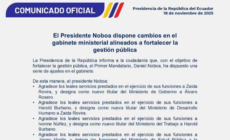 El presidente Daniel Noboa anunció este 18 de noviembre de 2025 una serie de ajustes en su gabinete con el